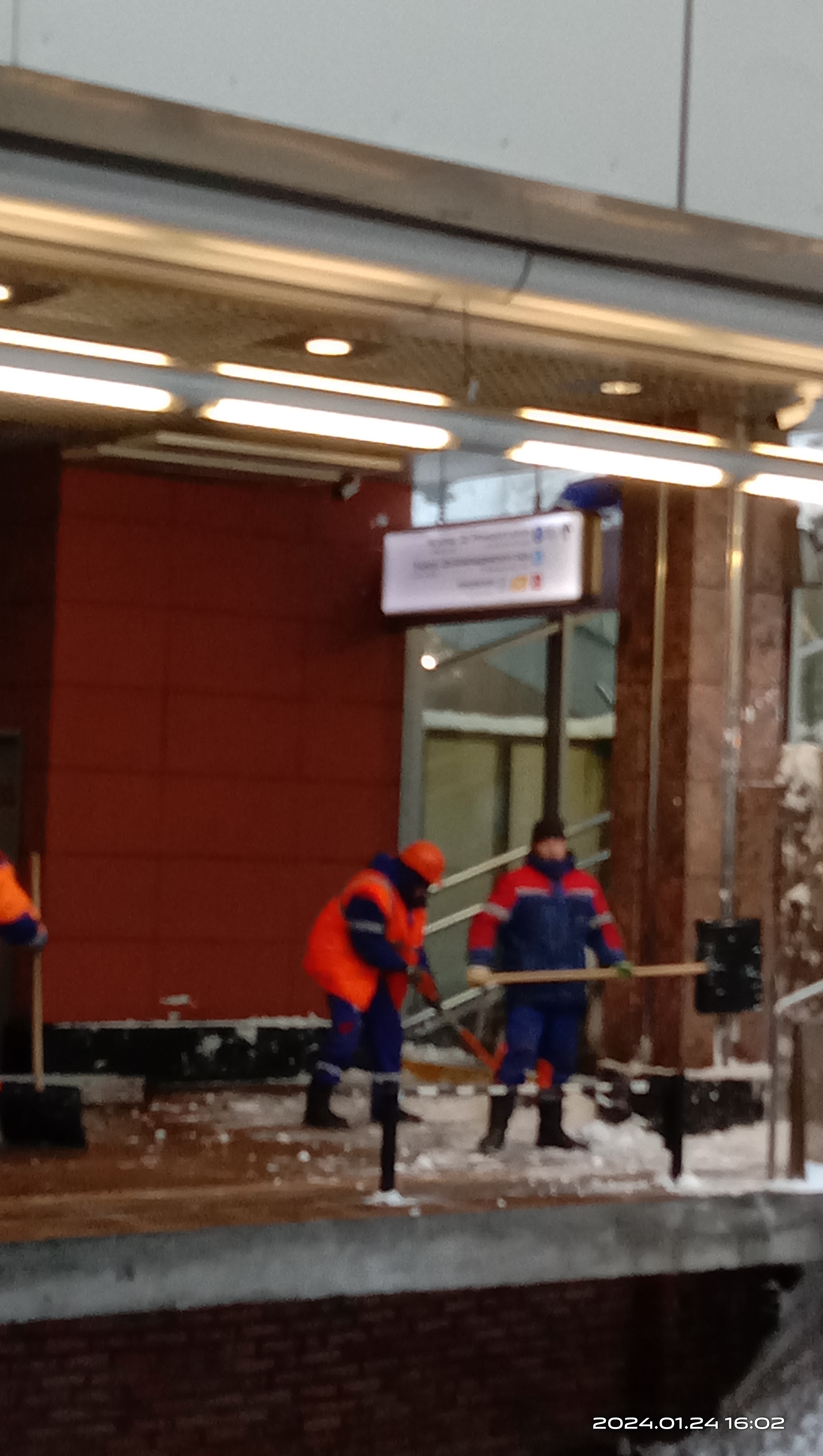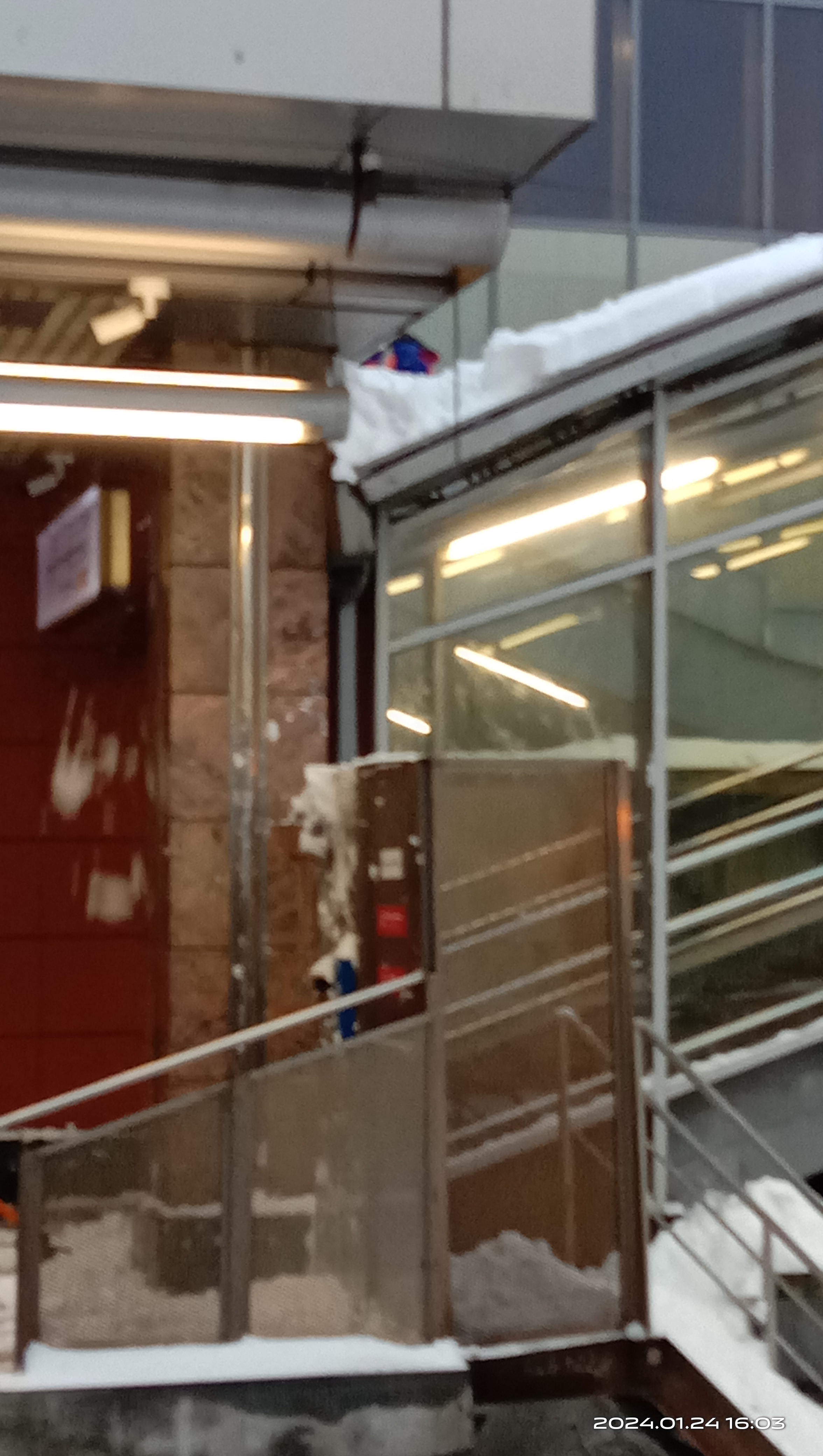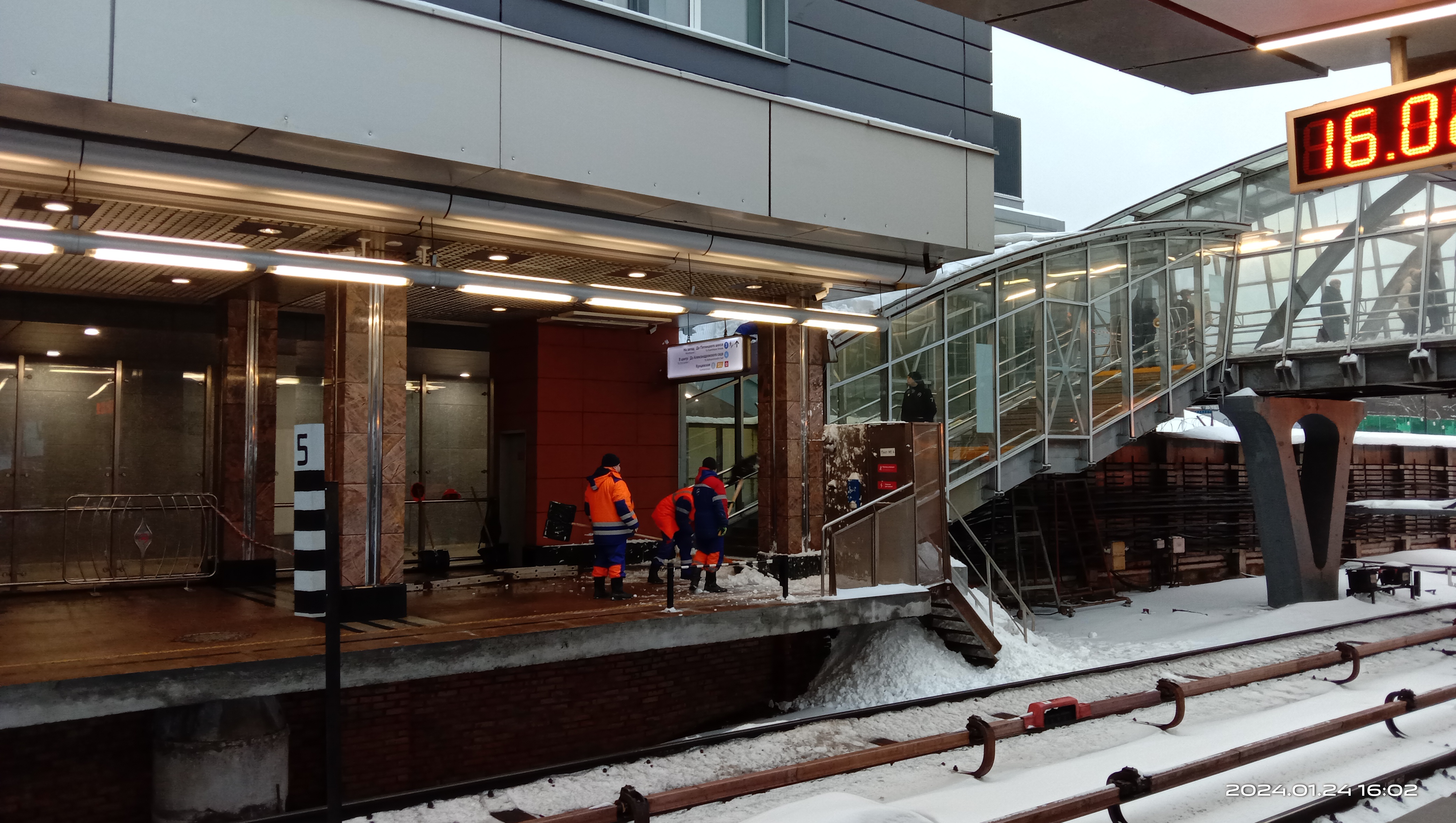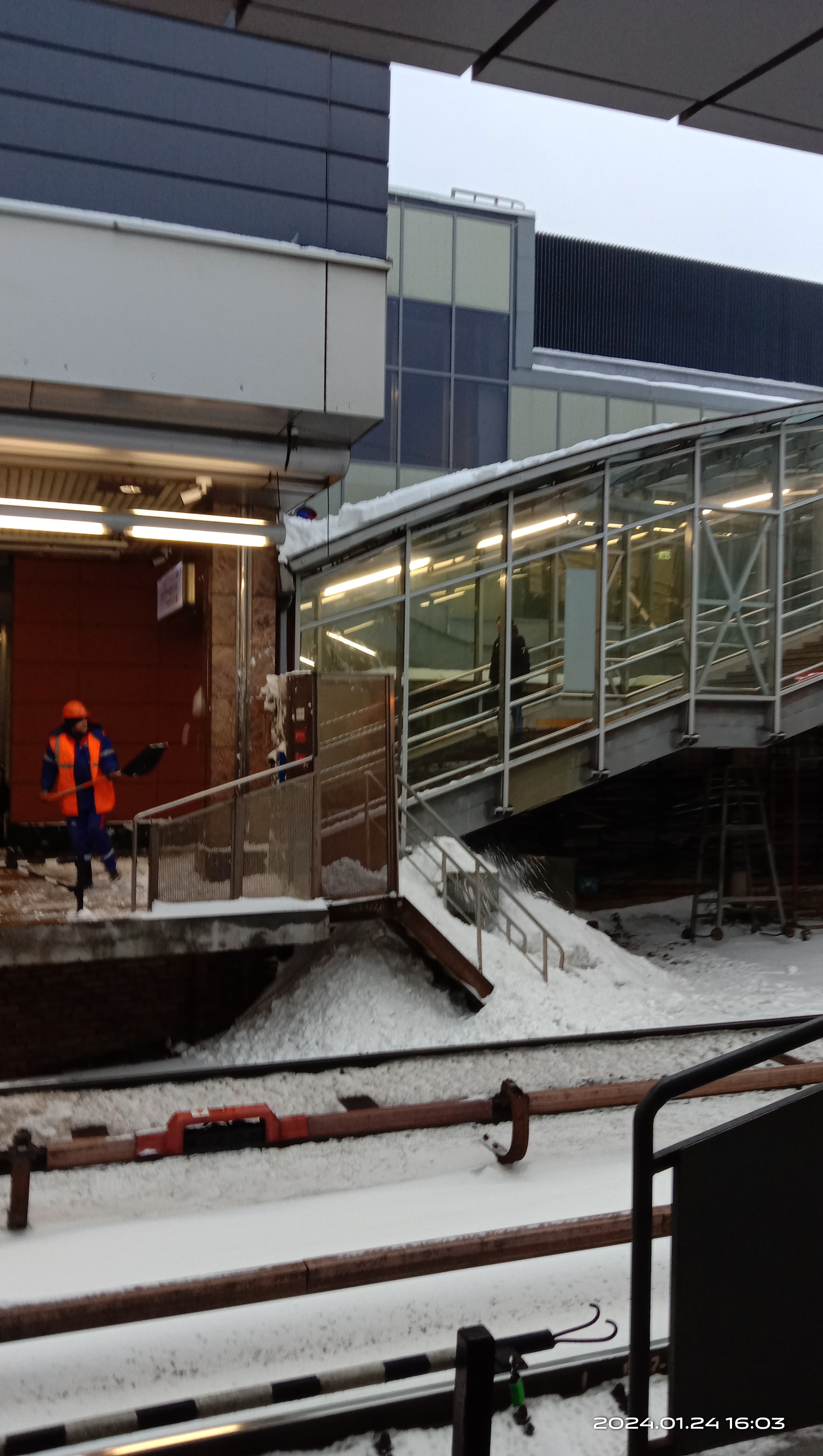 Я правда не понял как так получилось, то ли примыкание этой наклонной крыши к потолку платформы снегом разломало, то ли потекло, и они его разобрали теперь снег убирают чтоб обратно собрать...