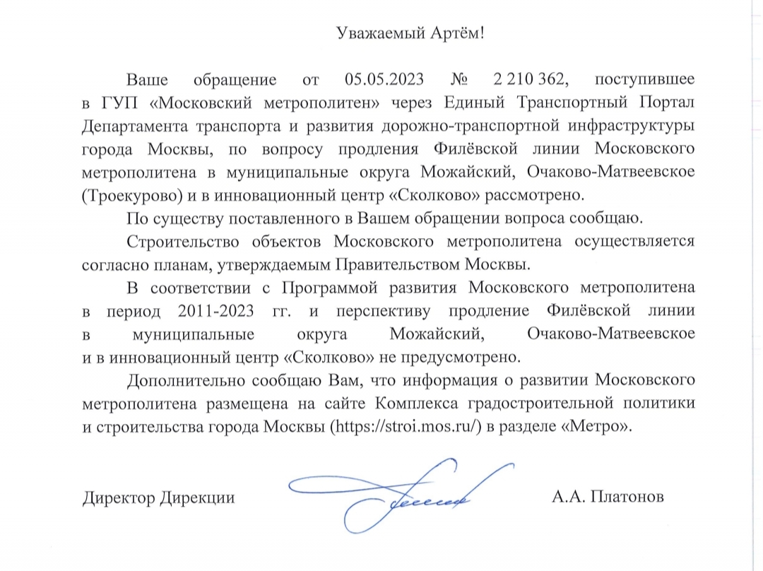Спросил насчёт продления Филёвки, ответ присутствует.