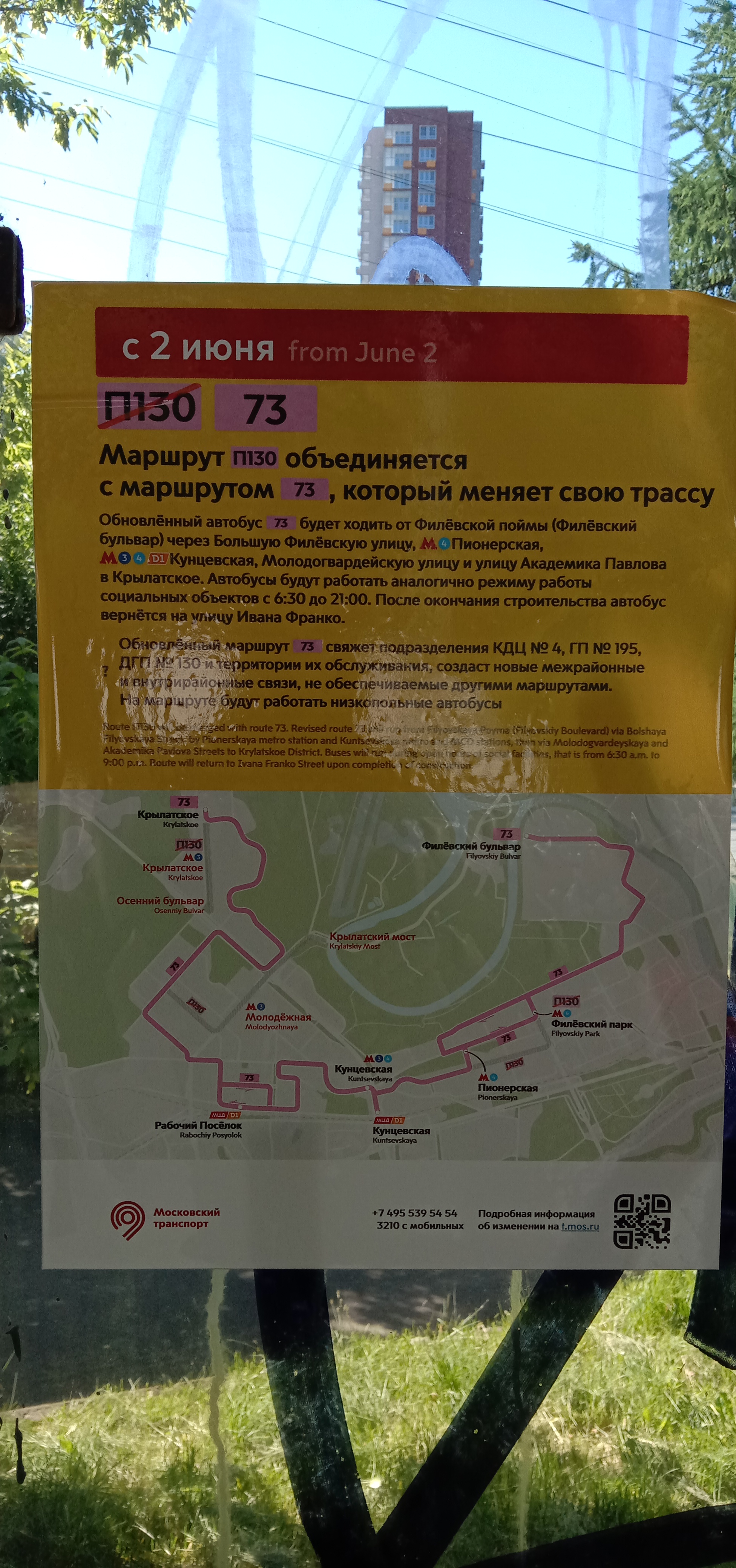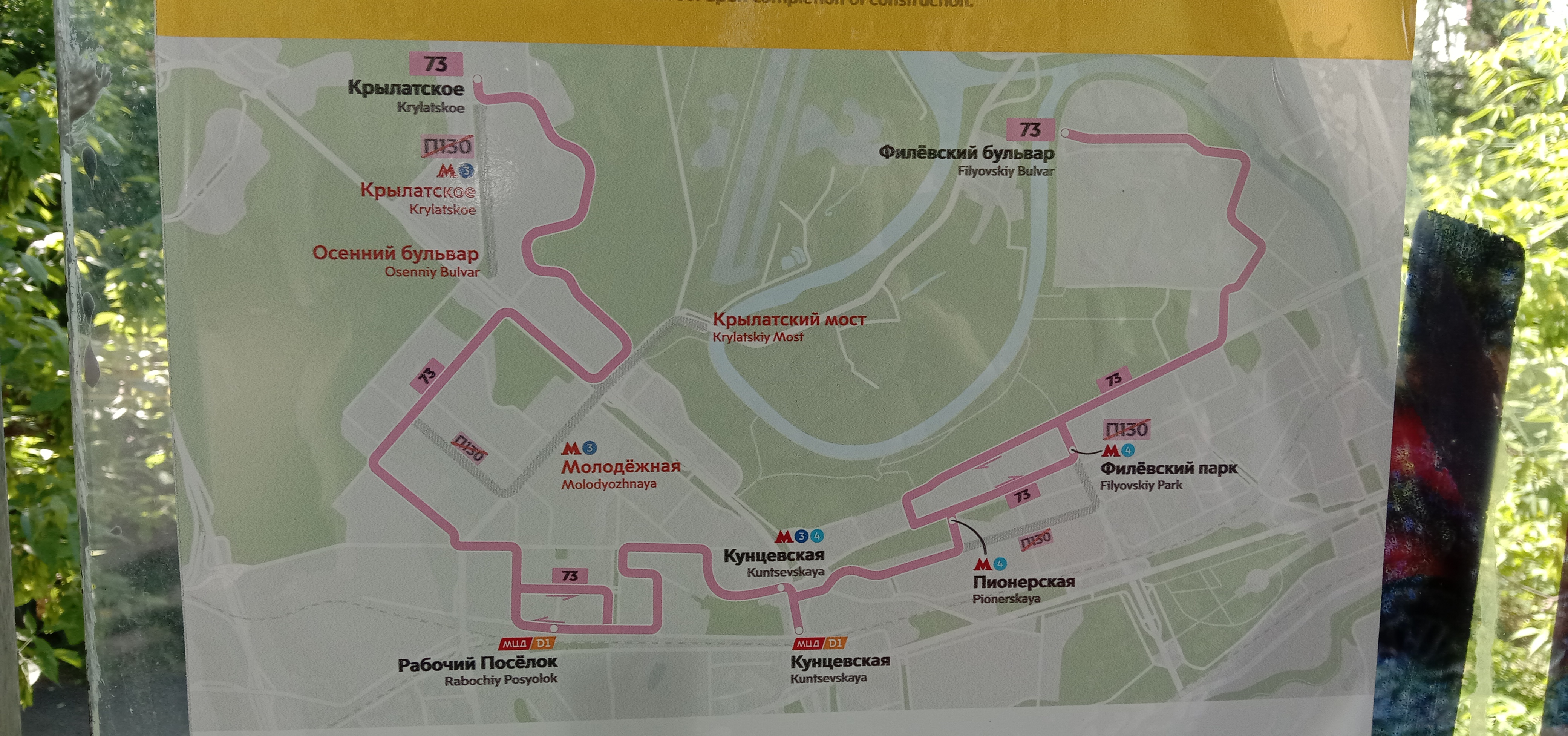 Что поражает, на всех виденных мной остановках 73-й до Молодёжной/Филёвского парка и отменённый П130 везде есть. И ни одного объявления/схемы изменений!