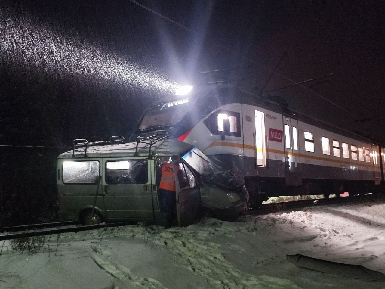 В подмосковном Дмитрове электричка едва не снесла грузовик, застрявший на путях. (+ видео)